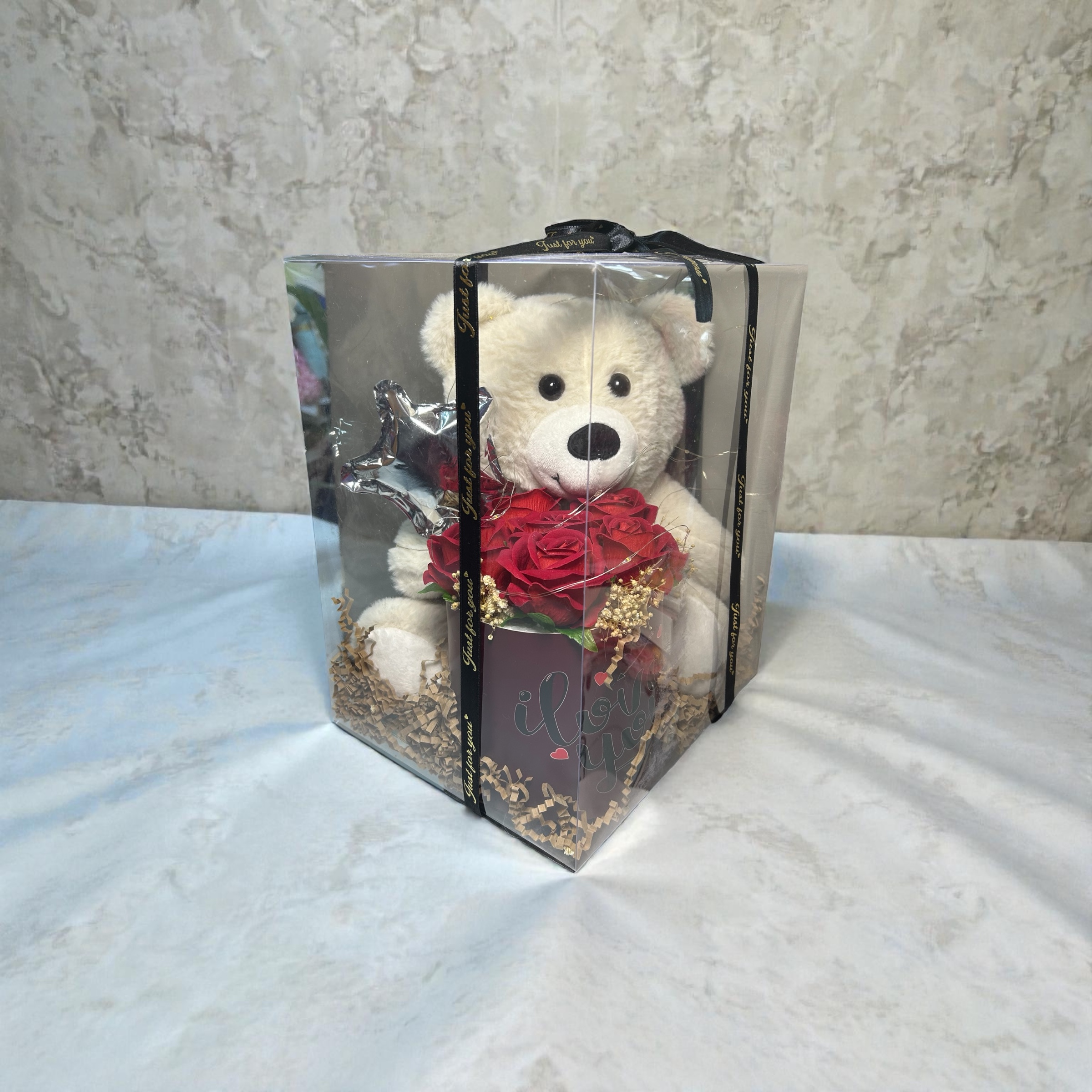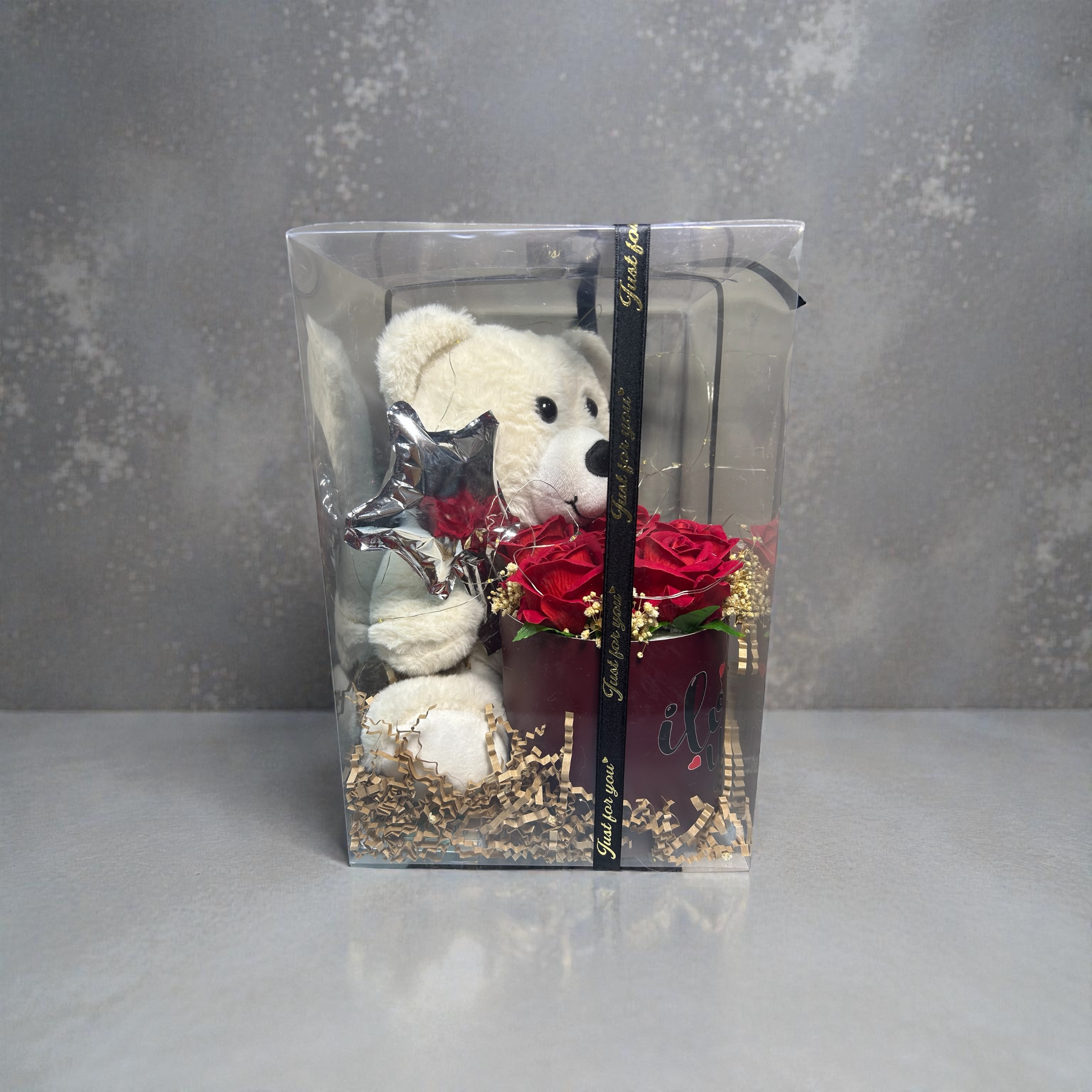 Işıklı Ayıcıklı Yıldız Detay Yapay Gül Kutusu
